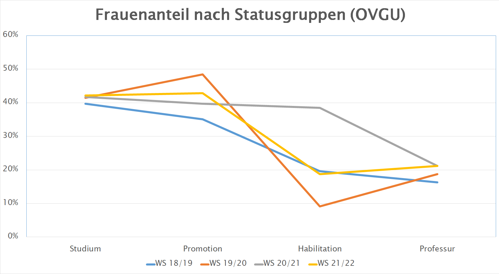 Auch an der Otto-von-Guericke-Universität findet sich diese "Leaky Pipeline" bei der Betrachtung des Frauenanteils nach Statusgruppen.